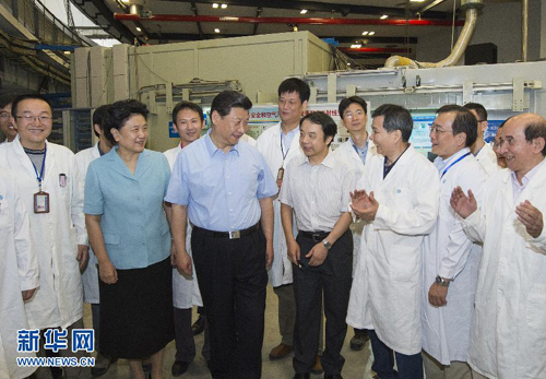 上午9時許,習(xí)近平來到中國科學(xué)院西郊科教園區(qū),首先考察了高能物理研究所。習(xí)近平走進(jìn)實(shí)驗(yàn)區(qū)3號廳,考察我國第一個大科學(xué)裝置北京正負(fù)電子對撞機(jī)。在高能物理所所長王貽芳的介紹下,他仔細(xì)察看對撞機(jī)加速器模型、儲存環(huán)等,了解該所在粒子物理、先進(jìn)加速器技術(shù)、先進(jìn)射線技術(shù)領(lǐng)域的發(fā)展成就和建設(shè)世界級科研中心的計(jì)劃,不時同科研人員交流。