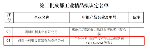 2024年9月6日,成都市經(jīng)濟(jì)和信息化局公示了第二批成都工業(yè)精品擬認(rèn)定名單,成都中科唯實儀器有限責(zé)任公司的半導(dǎo)體專用高精度真空壓力控制閥(GID-25ZM等型)產(chǎn)品通過成都市經(jīng)信局市新經(jīng)濟(jì)委相關(guān)處室審查,成都市發(fā)改、生態(tài)環(huán)境、應(yīng)急、市場監(jiān)管、海關(guān)等16個部門核查,相關(guān)行業(yè)、財務(wù)等專家評審,成功認(rèn)定成為了成都工業(yè)精品。